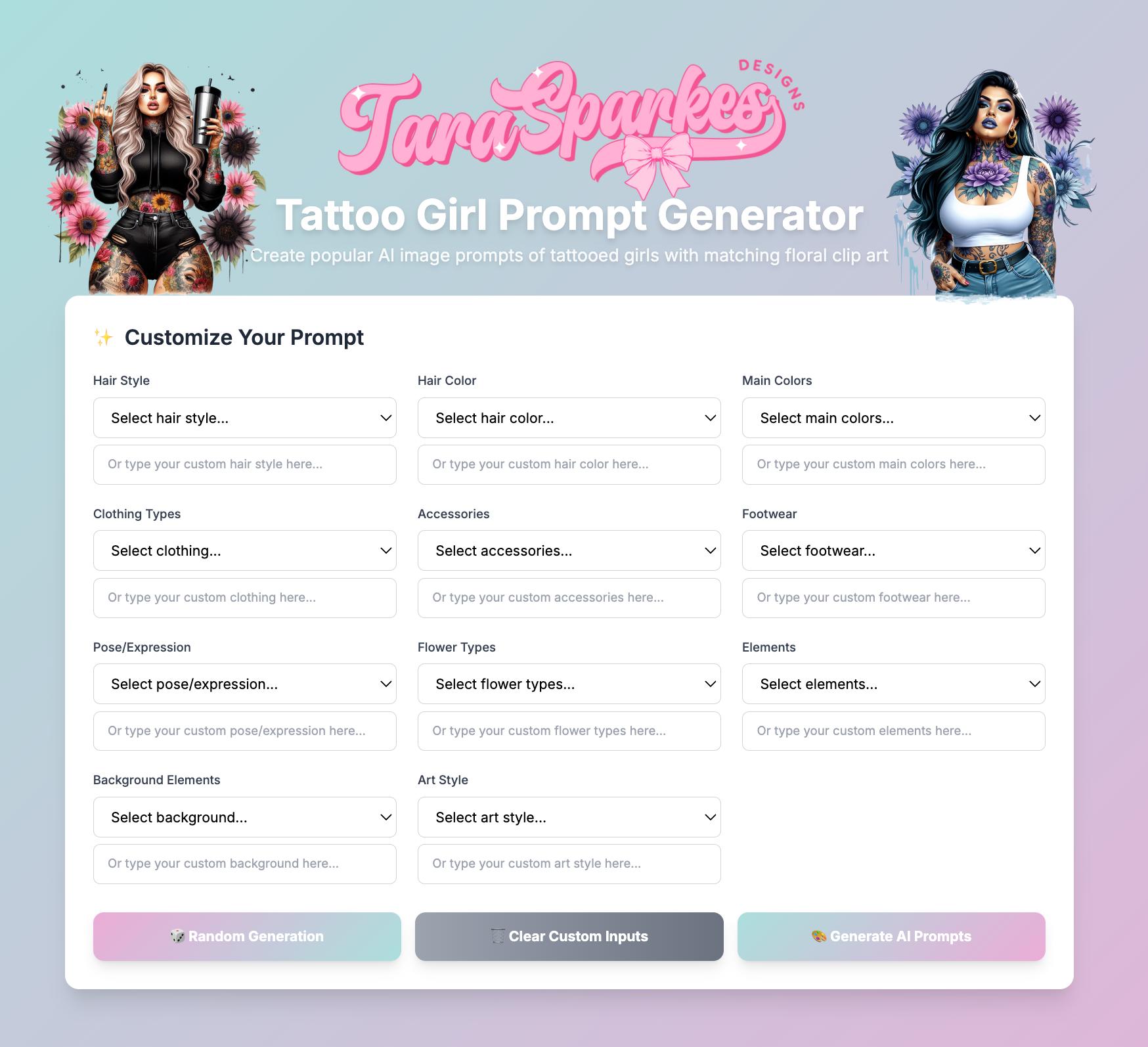 Includes matching floral prompt generator so you can pair your tattoo girl with coordinating flower designs.
