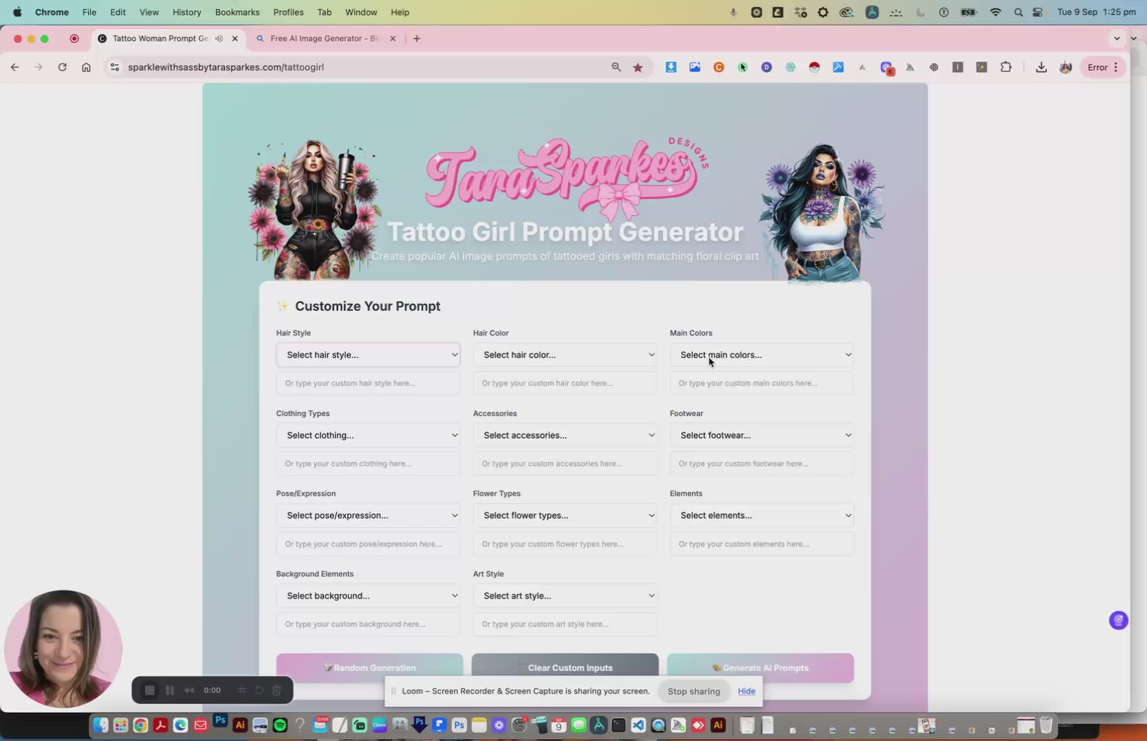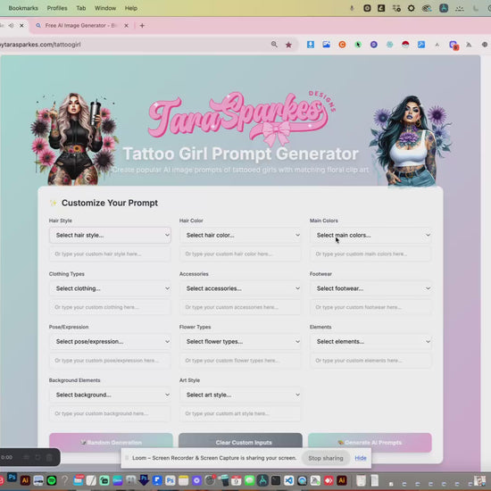 This Tattoo Girl Prompt Generator makes it easy to create detailed, unique prompts for AI image tools like Bing, MidJourney, and more. Perfect for designers, POD sellers, and anyone who wants consistent, creative results without starting from scratch.